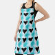 This graphic design, seems to glow, with black hearts, upon white squares-displayed on abstract, checkerboard pattern, of turquoise, shaded with blue.