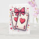 This greeting card features two heart-suit playing cards, the six and the nine, slightly overlapping in the center. A bright pink bow ties them together, with soft shading that makes it look like real ribbon. The cards are white with red hearts, and they feel sweet and friendly, like a little inside joke between two people. Tiny red hearts and small gold stars are sprinkled around like confetti, adding a festive touch ❤️. The background is pale with faint grid lines, keeping the focus on the cards and bow.