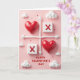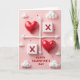 This Valentine's Day card shows a Tic-Tac-Toe board on a soft pink background, with curved white arrows forming the grid instead of straight lines. Two shiny red hearts sit in opposite squares, looking glossy and full, like they’re catching a bit of light. In the other spaces are two white squares, each stamped with a red “X” in thick, simple lettering. Small white clouds and tiny red hearts float around the board, giving the whole scene a light, sweet feel. At the bottom of the card, the words “HAPPY VALENTINE’S DAY” appear in all caps in red, set in a straightforward print style and centered along the lower edge. It feels like a gentle way to say love can be fun, and that you’re happy to be on the same team 🥰. Give it to a partner or a friend to share a little warmth and remind them they matter ❤️, and enjoy sharing Valentine’s Day sentiments.