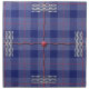 We call the original design by HomeWare on this Cloth Dinner Napkin “Mad Plaid in Blue”. The pattern is a basic plaid in shades of heather blue. Over this background are two wavy red lines, one horizontal and one vertical, which cross through the center of the design. The lines are three dimensional, throwing shadows on the plaid, and there is a round red button in the center, where the lines intersect. Over the far ends of the red lines, on four sides, there are blocks of textured, wavy white lines. There are also red dotted lines running through the lighter blue part of the plaid. It looks a bit like a package, all sealed and taped. Thus the name "Mad Plaid in Blue".