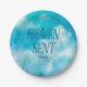 Dreamy and elegant baby shower plate featuring watercolor art of blue sky with clouds and stars. The text says "heaven sent."