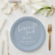 A modern minimalist baby shower paper plate featuring a cute hand-drawn heart and stylish typography on a dusty blue background. Designed by Thisisnotme©