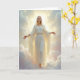 Designed with a serene sky setting, this card shows a lone woman floating among luminous clouds in soft cream, blush, and pale blue tones 🌷. A bright halo-like light sits directly behind her head, casting a gentle glow that softens her features and gives her upward gaze a tender, searching look, as if reaching for someone just out of view. She wears a long cream-white gown that falls in smooth folds, catching the light along the edges like satin and drifting slightly as though in a slow breeze. A matching veil frames her face and shoulders, adding a quiet, intimate feel to the scene, like a private moment shared between close hearts. Her arms extend outward with open palms, a welcoming gesture that reads like an embrace offered from afar, warm and steady. The main message appears centered near the top in soft gold lettering, with a smaller line of text placed near the bottom in pale gray, leaving plenty of open sky around the figure 🐇. Beneath her, the cloud layer gathers in rounded shapes with pearly highlights, and her bare feet peek just above the misty edge.
