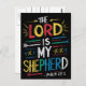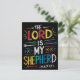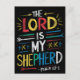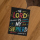 An artistic poster featuring the words The Lord is my Shepherd from the Bible, with a serene image of a shepherd guiding a flock of sheep in a peaceful meadow.