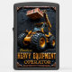 This imposing design is a powerful tribute to the heavy equipment operator who commands the specialized versatility of the telehandler. The central image features a massive, yellow telehandler (telescopic handler), its huge, heavy-duty tires dominating the foreground as it uses its boom to lift a pallet loaded with red bricks or blocks. This highlights the machine's essential role in material handling, lifting, and site logistics on construction projects. The telehandler is set against a dark, textured background and grounded by a strong, ornate industrial panel at the bottom, conveying a sense of immense, rugged capability and authority. This design celebrates the operator's precision, skill, and vital role in managing site materials. The bold, golden text "HEAVY EQUIPMENT OPERATOR" is clearly displayed, making this lighter an excellent, strong gift that celebrates the versatile capability and dedication of the professional who masters this all-terrain lift.