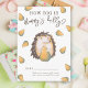 Gender neutral baby shower invitations. An illustration of a watercolor hedgehog with pear in paws, and many yellow pears. Matching items available.