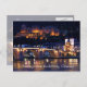A beautiful view of Heidelberg, Germany at night. The Heidelberg castle is visible up on the hill and right beneath it on the river are the old bridge and gate.