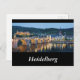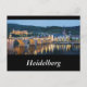 This postcard features a panoramic photograph of the Alte Brucke, Castle and River Neckar in Heidelberg, Baden-Württemberg, Germany, taken at evening time.
