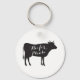 Carry around a funny piece on your key chain. This key chain is adorned with a black cattle and white script type font words that read "heifer please".