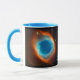 The blue-green glow in the centre of the Helix comes from oxygen atoms shining under effects of the intense ultraviolet radiation of the 120 000 degree Celsius central star and the hot gas.