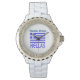 Wrist watch features the Greek flag and the word, HELLAS, below in blue. The flag shows blue and white stripes with a blue and white cross in the upper right area. Above it, add your name, in blue letters, for a personalized touch or create a customized gift. Fun for family reunions, travel groups, and sharing your love and pride in your heritage, ancestry and culture. Great for celebrating Oxi Day.