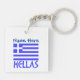Keychain features the Greek flag with the word, HELLAS, below in blue. The flag shows blue and white stripes with a blue and white cross in the upper right area. Above it, add a name, in blue letters, for a personalized touch or create a customized gift. Fun to take to family reunions, travel groups, and sharing your love and pride in your heritage. Fun for celebrating Oxi Day.