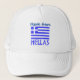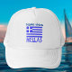 Trucker hat features the Greek flag and the word HELLAS, below in blue. The flag shows blue and white stripes with a blue and white cross in the upper right area. Above it, add a name, in blue, for a personalized touch or create a customized gift. Fun for Greek family reunions, travel groups, and sharing your love and pride in your heritage, ancestry and culture. Great for celebrating Oxi Day, too.