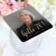 This custom 70th birthday paper coaster features the guest of honor's personalized photo, name, and birthday, along with the phrase "hello 70!" in elegant gold-colored calligraphy script. A dark screen helps make the text pop. A great way to celebrate someone who's turning seventy!