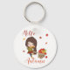 Keychain image features girl with bucket full of apples and pumpkins and some leaves around.