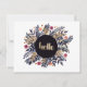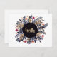 The illustration is made with watercolors and gouache on paper. Indigo, burnt yellow and orange foliage and flowers with a hand written golden hello in the middle.