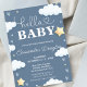 Hello Baby Dusty Blue Clouds Modern Baby Shower Invitation