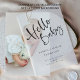 Hello Baby Modern Script Birth Announcement. Hello Baby is in stylish modern set script and the rest of the words you can easily personalise. Vellum translucent invitations offer a refined and modern design that can be standalone or layered over a background card for an extra special touch. Perfectly versatile, these overlays pair beautifully with background designs such as photos, floral graphics, or bespoke artwork. PLEASE NOTE: This listing is for the vellum overlay only. Background cards are sold separately.