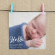 Simple white typography overlay of Hello and your beautiful baby boy photograph on this simple photo birth announcement postcard. Customize this cute small card with birth details of your baby boy or girl and a second photo for a lovely minimalist card. Full photo bleed on the front.
