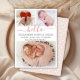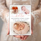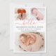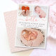 Baby Girl Birth Announcement 3 Photo Collage Cards. Elegant minimalist cute birth announcement featuring 3 of your favorite baby photos on front, with a pretty hand lettered text „hello” in a swirly calligraphy script with swash or tails in blush pink. Add your baby's name on the front and birth stats. At the back side white dots blush pink background. You can easily personalize it.