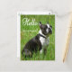 Aww...Who can resist the face of a Boston Terrier puppy dog? This fun postcard features an image of a black and white Boston Terrier pup sitting in the tall green grass with a hello greeting printed in a white script font.