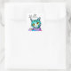 Teal, purple, pink and blue kitty cat with yellow eyes saying Hello! Stick these stickers on your envelopes to seal.