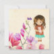 hello text personalized and a cute girl holding cat with wreath pink and violet flowers.