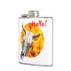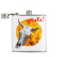 Cow skull against the background of fire and flames. Text - Hello! Customizable hip flask. You can change the image and the text.