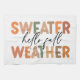 This vibrant fall artwork perfectly captures the cozy essence of the season with its playful typography and warm color palette. The design features the bold phrase "Sweater Weather" in large, blocky letters that alternate in shades of orange, beige, green, and brown, evoking the changing colors of autumn leaves. The phrase "hello fall" is nestled in between, written in a flowing, cursive script that adds a touch of elegance and warmth to the design.
