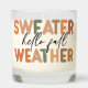 This vibrant fall artwork perfectly captures the cozy essence of the season with its playful typography and warm color palette. The design features the bold phrase "Sweater Weather" in large, blocky letters that alternate in shades of orange, beige, green, and brown, evoking the changing colors of autumn leaves. The phrase "hello fall" is nestled in between, written in a flowing, cursive script that adds a touch of elegance and warmth to the design.
