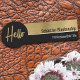 This professional name tag features a name in black on the faux gold metallic background and below the title in white centered over a black background. On the left is a template Hello greeting in gold script is in the circle on the left which you can keep, can be shortened to Hi or removed. Personalize the personal text fields or edit using the design tool to select a font style, size, and color you prefer.