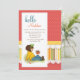 A charming girl's birthday party invitation depicting a little girl sitting on the ground saying hello to a bird. The bright red polka dot background also features a striped and scalloped panel.