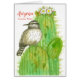 A blank greeting card decorated with a fluffy cactus wren perched on a saguaro cactus in bloom with white blossoms drawn with sepia ink and painted with watercolor. Inspired by the state bird and state flower of Arizona. You can edit or remove the text to fit your needs.