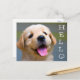 Brighten someone's day with a handwritten note! This adorable hello postcard features an image of a happy Golden Retriever puppy dog highlighted against a creamy blue and yellow background. She is ready to help you send smiles to friends and family.