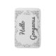 Unique bath mat with "Hello Gorgeous" swirl pattern grey hand-lettered in brush calligraphy.