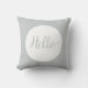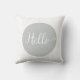 This cute script typographic "hello" pillow is in a soft grey gray and white reversible pattern theme.
