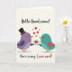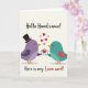 This greeting card shows two cute birds sharing a sweet moment on a soft, creamy background. On the left, a lavender bird wears a black top hat with a red band and holds out a white envelope sealed with a red heart. On the right, a teal bird with a reddish-orange wing smiles gently as it accepts the message. Above the envelope, small red and light pink hearts float in the air, adding a clear romantic feel ❤️. The text “Hello Handsome!” appears near the top in red, written in a casual, handwritten style. Near the bottom, it says “Here is my Love card!” in the same hand-drawn look, with the word “Love” in brighter red to stand out 💌🍫. Hope this helps you share your Valentine’s Day sentiments with someone special.