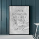 Hello in a black, modern font, written in seven languages: spanish, french, swedish, chinese, hawaiian, italian and english. Very trendy for your home.