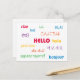A fun and colorful post card that says hello in many languages like English, Italian, Norwegian, Japanese, Spanish and more!