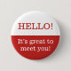 This red and white button design features the messages "HELLO!" and "It’s great to meet you!". It could perhaps be used as a friendly way to greet people.