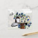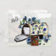 Mailbox art postcard is blank for a hand-written message. Pen and colored pencil artwork shows an open mailbox covered in blue-flowering vines and letters inside. The hand-drawn image is set over a transparent background of a stone house in the country. That image is also printed on the reverse.