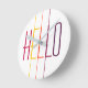 Trendy modern red, orange, burgundy, indigo and yellow HELLO typography throw pillow with colorful vertical stripes.