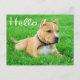 Brighten someone's day with handwritten note! This fun canine Hello postcard features an image of a light brown and white Pit Bull puppy dog resting in the green grass.