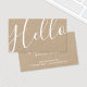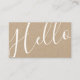 featuring word " hello" in white modern calligraphy font style on front side and details in modern sans serif font style on back side.