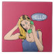 A pop art illustration of a woman trying to talk on a broken old retro telephone. The dial phone has a cut chord and does not work. A funny retro, comic book style illustration.