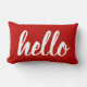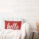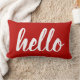 Greet guests for the Christmas holidays with this modern red lumbar pillow featuring script "hello" typography in white.