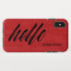 The word "hello" in a modern black cursive script font takes up two thirds of this cool case with a printed red linen texture photo background. A custom name is at the lower right in a smaller simple black sans serif font. Personalize it by adding your name or text in the sidebar. Make a great customized gift.