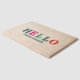 Hello simple family name outdoor rug for home, new homeowners, family, parents, adults. Modern colorful typography with hello word, and family name. Minimalist typography rug with colorful letters (green orange, green)