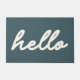 This stylish doormat features a modern minimalist design of the word Hello in script lettering on a dusty teal green background.