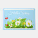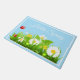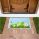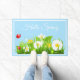 Doormat is shown with a light sky-blue color background and white border with a hello spring text and a lovely flowers print.